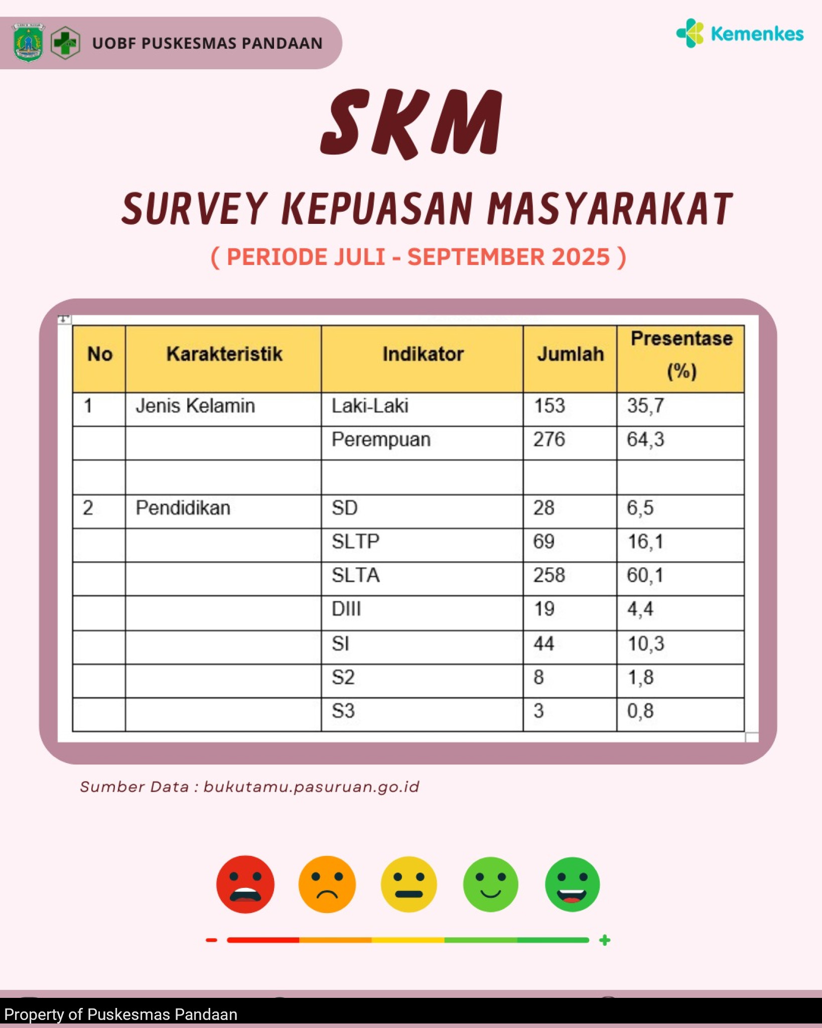 UOBF Puskesmas Pandaan kembali melaksanakan Survei Kepuasan Masyarakat (SKM) pada Triwulan III Tahun 2025 sebagai upaya untuk mengukur tingkat kepuasan masyarakat terhadap pelayanan yang diberikan.